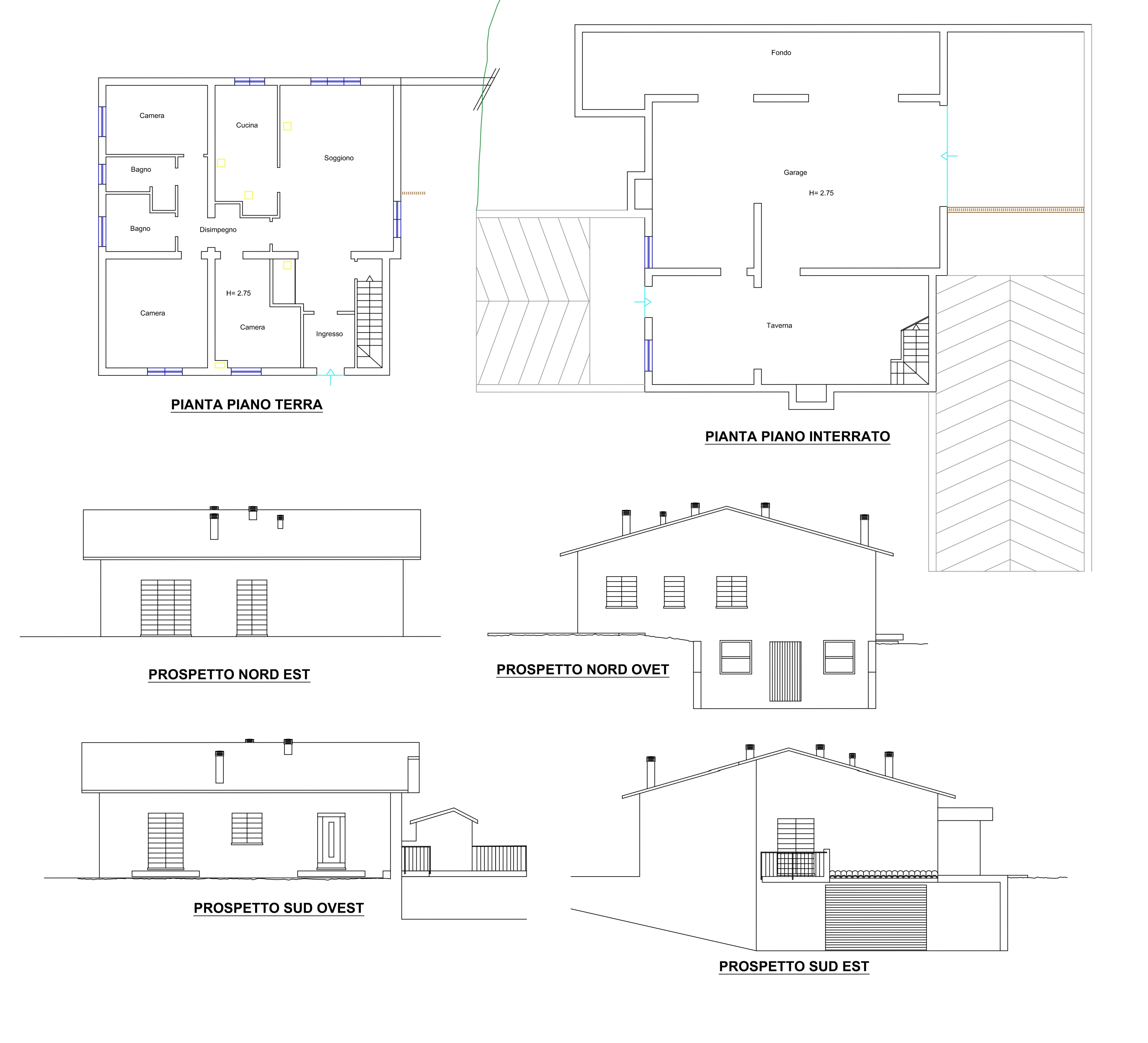 L'abitazione principale si sviluppa al piano terra con una superficie di 130 mq, dove sono presenti: ampio ingresso, salone con idrocamino, cucina abitabile, corridoio, tre camere da letto e due bagni; tutto il reparto giorno, come anche la camera padronale, hanno uscita diretta sull'esterno. Una scala interna conduce al piano seminterrato, dove sono presenti taverna, garage ed ampi fondi (attualmente allo stato grezzo - impiantistica già interamente predisposta), per una superficie complessiva di 170 mq; a questo livello si può accedere anche autonomamente dall'esterno.